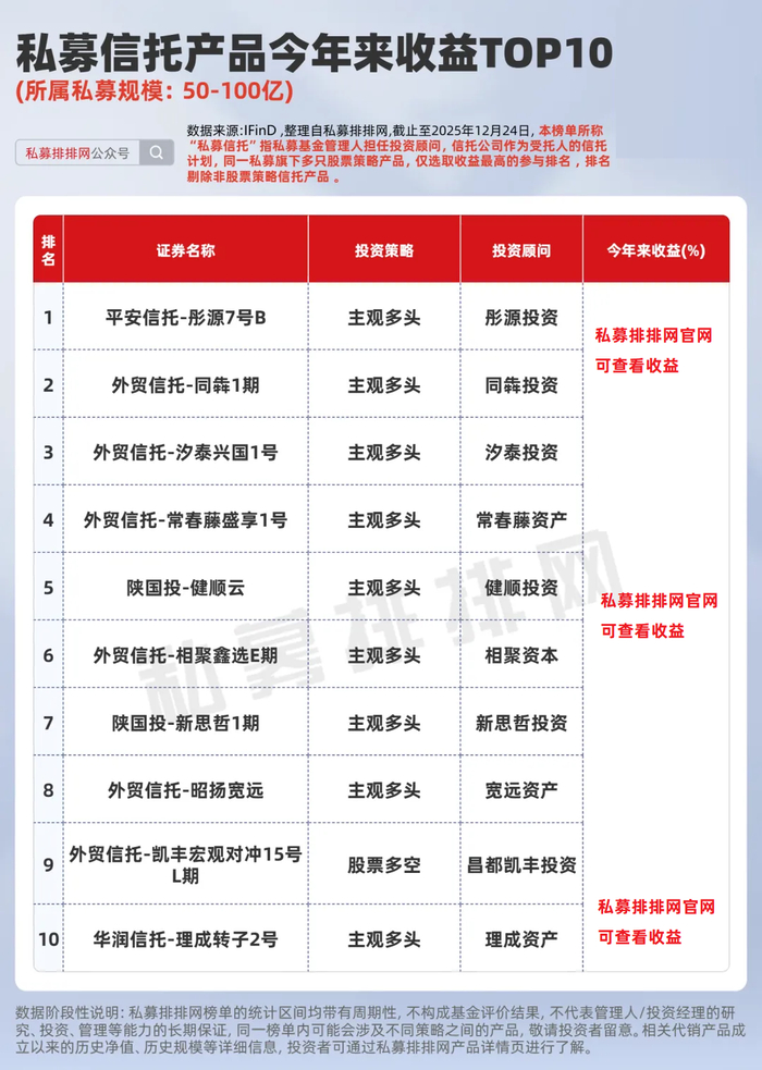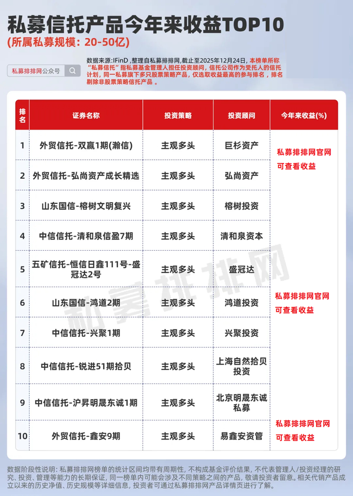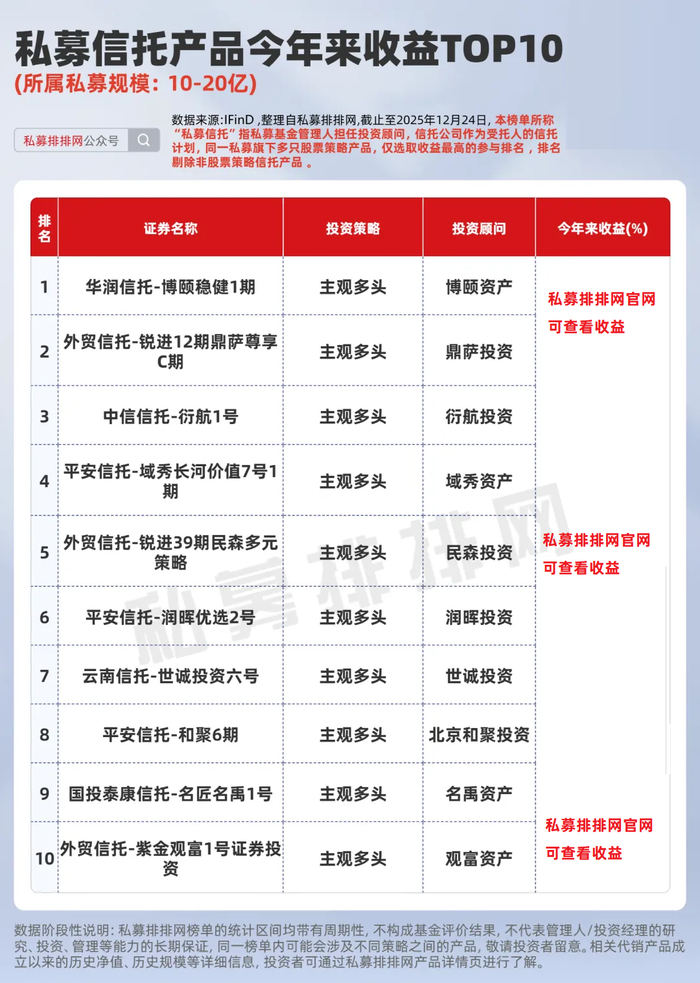 私募管理人担任信托产品投资顾问,不仅是业务拓展的机遇,更是整体投资研究能力、市场分析能力和资产配置能力的重要体现。为此,本文按不同规模私募,分别梳理出今年来业绩前十的股票策略信托产品,供投资者参考。(同一私募管理的相同策略,仅选取收益最高的产品参与排名)