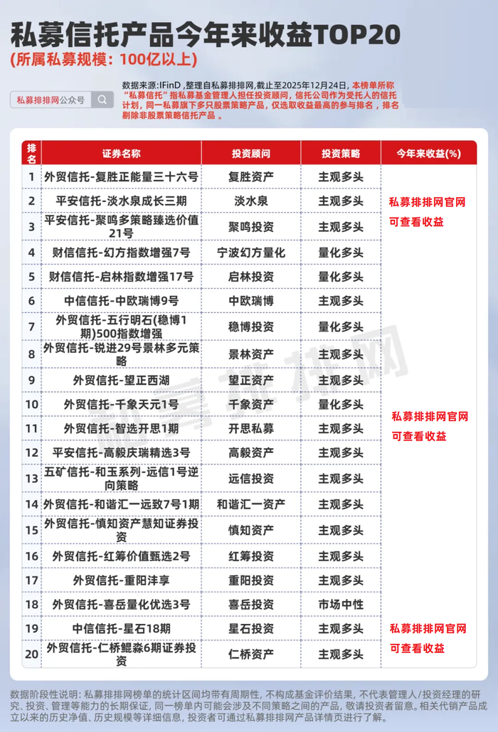 此外,老牌知名私募景林资产、高毅资产上榜。景林资产担任投资顾问的“外贸信托-锐进29号景林多元策略”今年来收益为***%,位居第8;高毅资产担任投资顾问的“平安信托-高毅庆瑞精选3号”今年来收益为***%,位居第12。