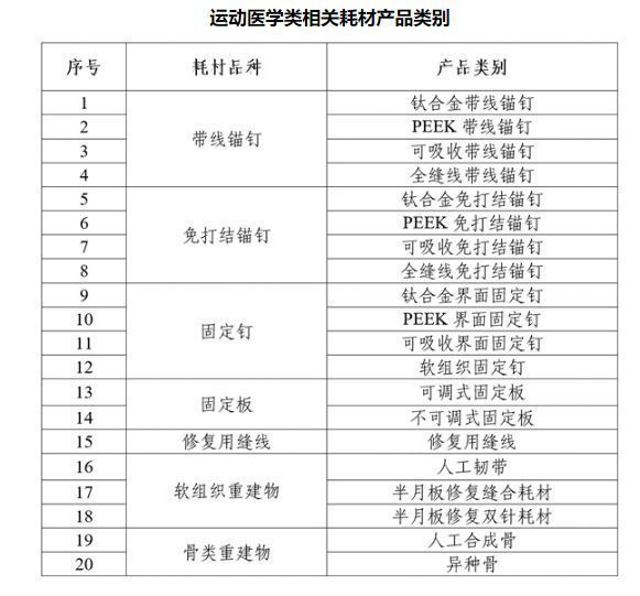 此次纳入国采的运动类相关耗材产品类别主要包括植入物的固定物品,如带线锚钉、免打结锚钉、固定钉、固定板、修复用缝线等。