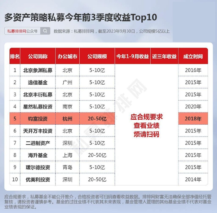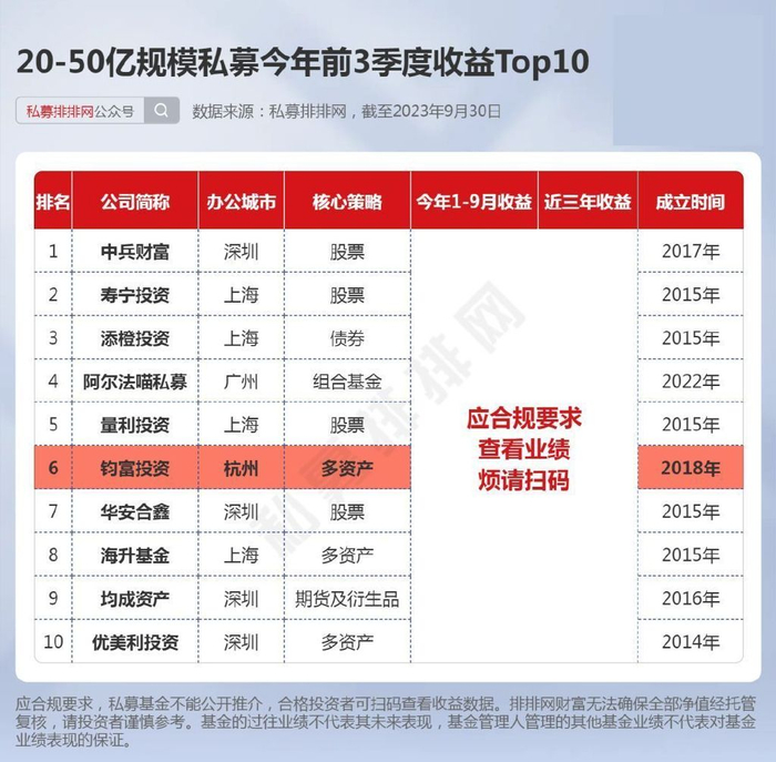 正因如此,凭借着多资产策略的优势和公司出色的投研能力和严格的风控体系,钧富投资在同等规模(20-50亿)私募中今年1-9月收益排第6。