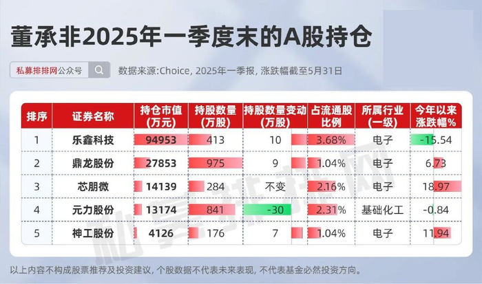 Choice数据显示,2025年一季度,董承非所管的私募产品共现身5家公司的前十大流通股东名单中,持股市值合计约为15.42亿元。其中,半导体A股公司占4家,合计持股市值超14亿元。