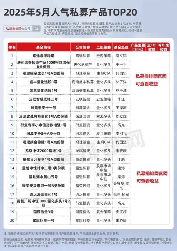 人气位居前5的产品分别由路远私募路文韬、进化论资产王一平、观理基金何国坚、海南盛丰私募林子洋管理。其中,海南盛丰私募林子洋上榜的2只产品均进入前5。