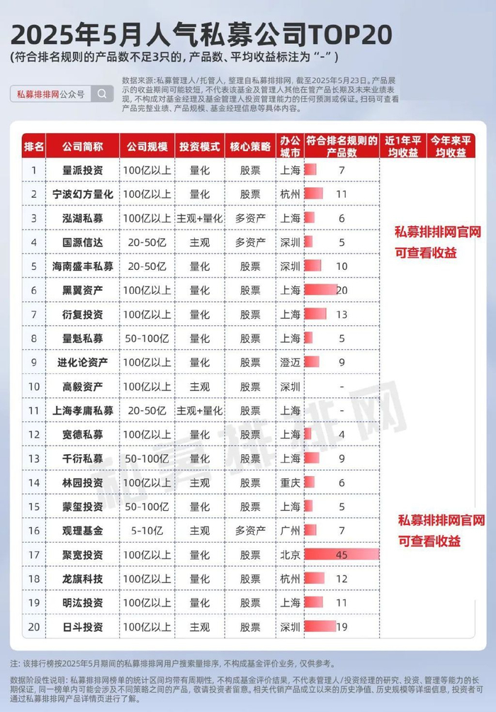 在三大主要市场呈现震荡修复行情的背景下,但斌等基金经理的业绩出现反弹,同时,也有“顶流”基金经理主动“封盘”。笔者因此根据私募排排网用户5月的搜索次数,特发布私募排排网5月人气私募公司、基金经理及产品榜单,供大家参考。(注:本文业绩数据截至5月23日,部分私募产品的净值因暂时未更新不列入本文统计和排名)