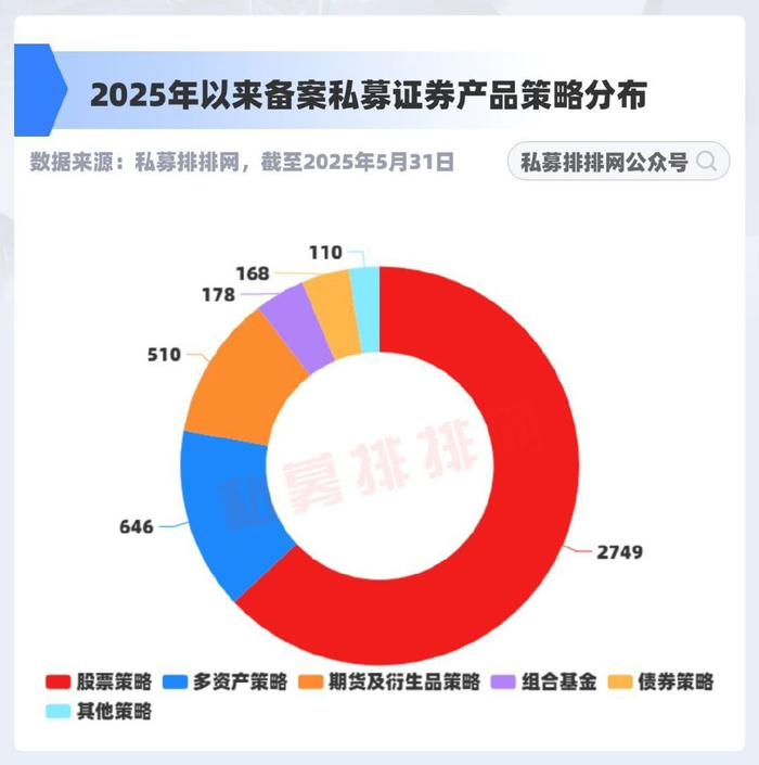 从策略分布来看,股票策略仍占据绝对主导地位。私募排排网数据显示,今年以来备案的私募证券产品中,股票策略产品达2749只,占比高达63.04%,凸显其作为核心配置资产的市场地位。多资产策略和期货及衍生品策略分列第二、三位,备案数量分别为646只和510只,各占总量的14.81%和11.69%,显示出投资者对多元化资产配置的需求。相比之下,组合基金和债券策略的市场热度相对较低,年内备案数量均未突破200只,两者合计占比不足10%。