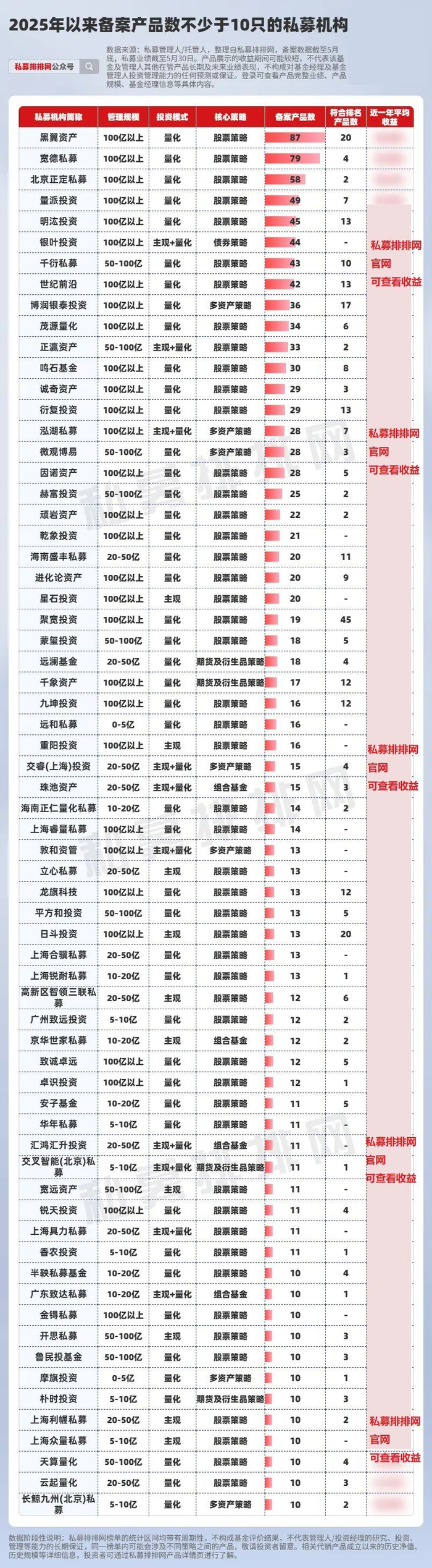 今年以来,备案产品数量不少于10只的私募机构共有66家,管理规模在50亿以上的私募占比超5成,共计40家,其中量化私募占到31家。百亿量化私募黑翼资产(点击查看公司业绩)年内备案产品87只居首,其次是百亿量化私募宽德私募备案产品79只紧随其后。