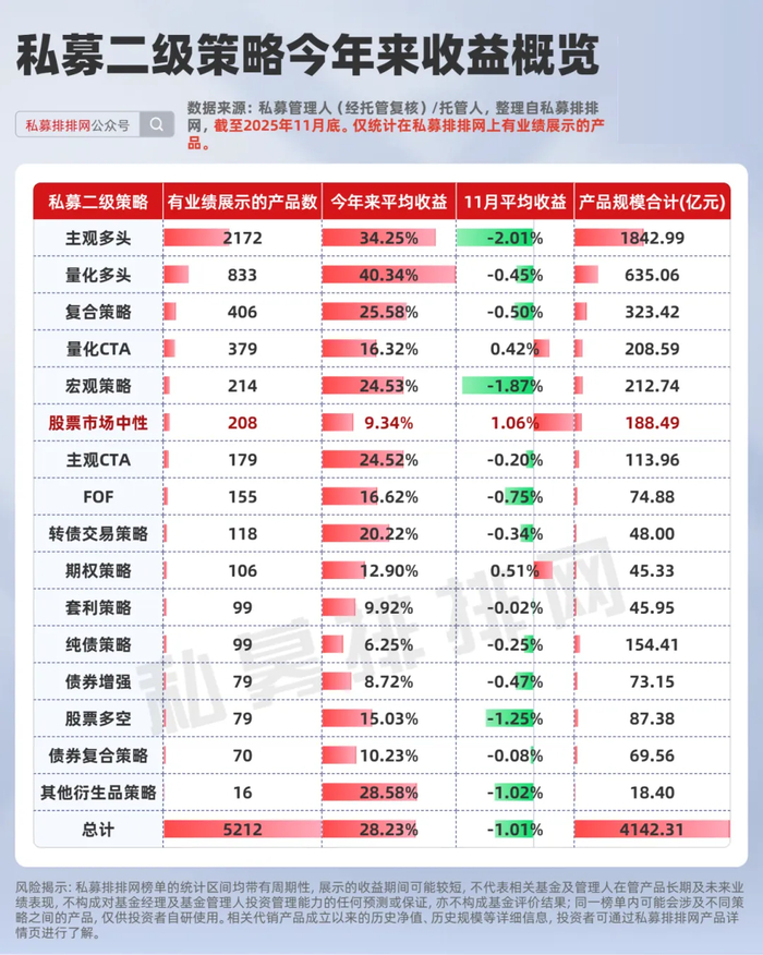 截至2025年11月底,百亿私募旗下在私募排排网上符合排名规则且有业绩展示的股票市场中性产品共有50只,今年来收益排名前10的上榜“门槛”超***%,位居前3的股票市场中性产品依次来自:平方和投资、进化论资产、明汯投资。