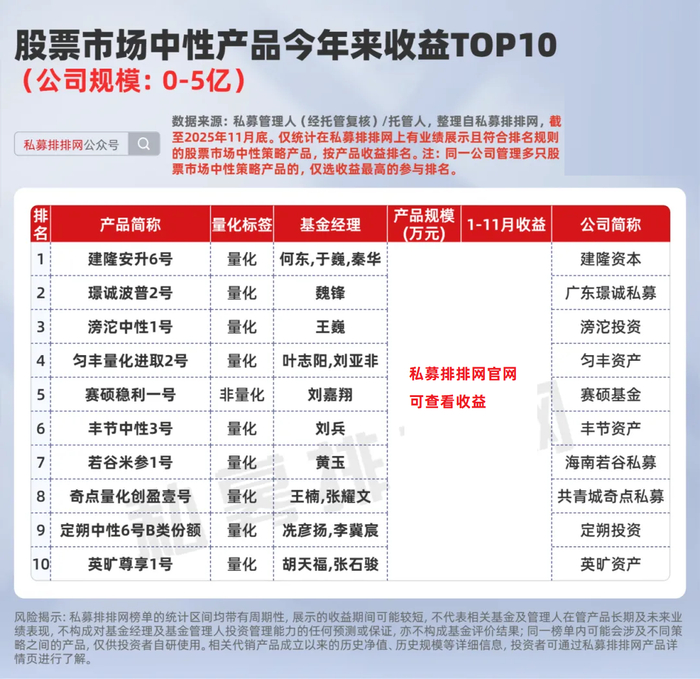 截至2025年11月底,0-5亿规模私募旗下在私募排排网上符合排名规则且有业绩展示的股票市场中性产品共有39只,今年来收益排名前10的上榜“门槛”为***%,位居前3的股票市场中性产品依次来自:建隆资本、广东璟诚私募、滂沱投资。