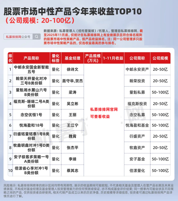 截至2025年11月底,20-100亿规模私募旗下在私募排排网上符合排名规则且有业绩展示的股票市场中性产品共有49只,今年来收益排名前10的上榜“门槛”超***%,位居前3的股票市场中性产品依次来自:中邮永安资产、翰荣投资、量魁私募。