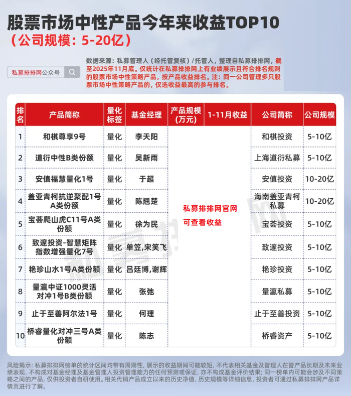 截至2025年11月底,5-20亿规模私募旗下在私募排排网上符合排名规则且有业绩展示的股票市场中性产品共有42只,今年来收益排名前10的上榜“门槛”为***%,位居前3的股票市场中性产品依次来自:和棋投资、上海道衍私募、安值投资。