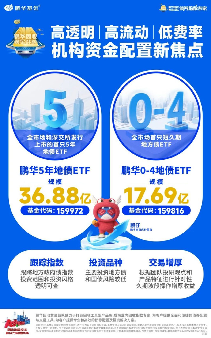 在债券ETF市场蓬勃发展的浪潮中,鹏华固收作为重要参与者表现突出。 据Wind数据,截至9月29日,鹏华固收旗下债券ETF整体规模突破240亿元。除科创债ETF外,鹏华固收目前还布局了5年地债ETF(159972.SZ)、0-4地债ETF(159816.SZ),分别定位为波段交易工具、场内资金管理工具,其中5年地债ETF是全市场规模最大的地方债ETF,达36.88亿元,0-4地债ETF规模达17.69亿元。