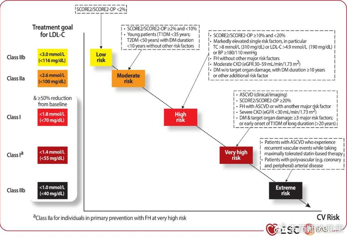 为了更好的解读这个问题,借用2025年8月欧洲心脏学会(ESC)更新的血脂管理指南中的一张图来为大家解读心血管疾病不同风险分层的低密度脂蛋白管理目标。