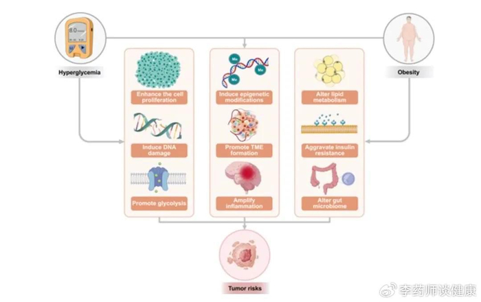 糖尿病自身的高血糖会促进恶性肿瘤细胞的糖酵解,为癌细胞提供更多的能力,同时也是引发细胞DNA损伤,刺激细胞过度增殖,促进肿瘤微环境生成的重要危险因素。此外,很多2型糖尿病患者还伴有肥胖的问题,而肥胖本身就与多种癌症风险的增加密切相关。