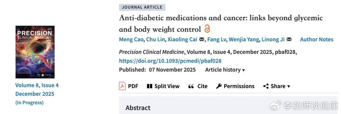 Meng Cao, Chu Lin, Xiaoling Cai, Fang Lv, Wenjia Yang, Linong Ji, Anti-diabetic medications and cancer: links beyond glycemic and body weight control, Precision Clinical Medicine, Volume 8, Issue 4, December 2025, pbaf028.