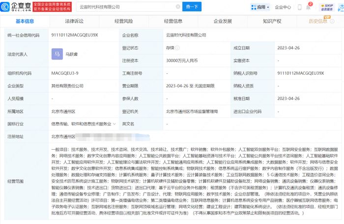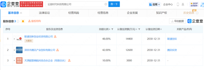 云宙时代法定代表人为马跃睿,注册资本3亿人民币,经营范围包括互联网数据服务、人工智能公共数据平台、量子计算技术服务、基于云平台的业务外包服务等。股东信息显示,该公司由联通创新创业投资有限公司、深圳市腾讯产业创投有限公司与天津数智梯航科技合伙企业(有限合伙)共同持股,其中联通创投与腾讯产投分别持股48%、42%。