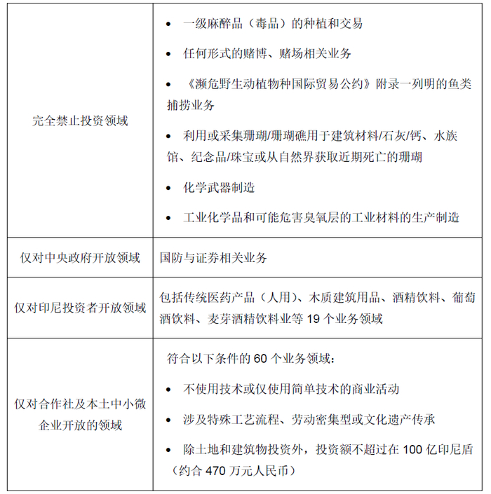 印尼的禁止外商投资领域可分为“完全禁止投资领域(本国投资者同样不可投资)”“仅对中央政府开放领域”“仅对印尼投资者开放领域”和“仅对合作社及本土中小微企业开放的领域”。