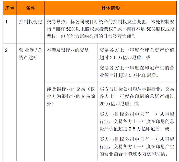 若外国投资者拟以并购形式投资印尼企业,且并购交易同时满足以下条件的,应当在交易交割完成后30个工作日内向印尼商业竞争监督委员会进行申报: