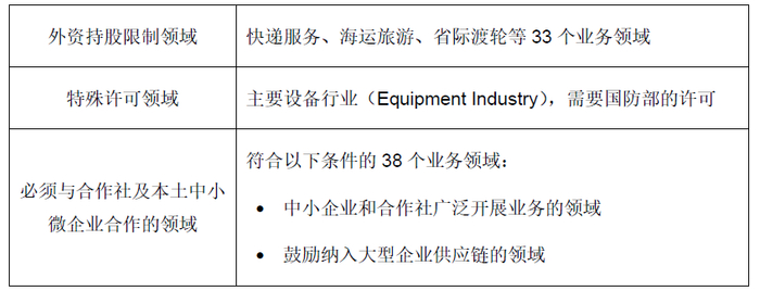 印尼对外商的有条件开放领域可分为“外资持股限制领域”“特殊许可领域”“必须与合作社及本土中小微企业合作的领域”,具体内容规定在《投资与业务领域总统令》附件II中。