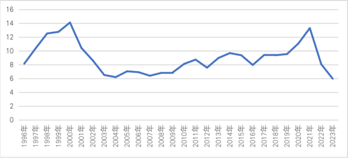 11996年以来乌克兰矿石与金属出口占商品出口的比