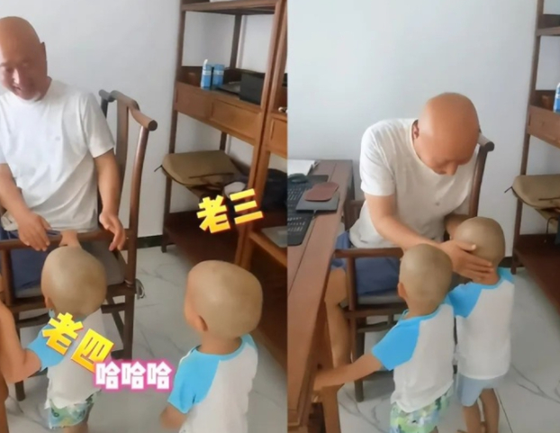 而两个双胞胎小儿子虽然没有正脸,但被爸爸带着去剃了光头,两个光秃秃的后脑勺,从后面看上去,简直和爷爷和曾爷爷一模一样啊~
