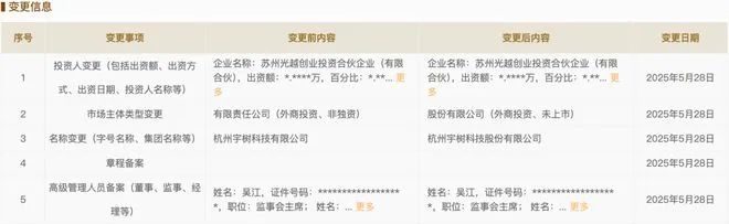据国家企业信用信息公示系统,宇树科技在5月28日进行了名称、市场主体类型、投资人、经营范围变更和高管人员备案。