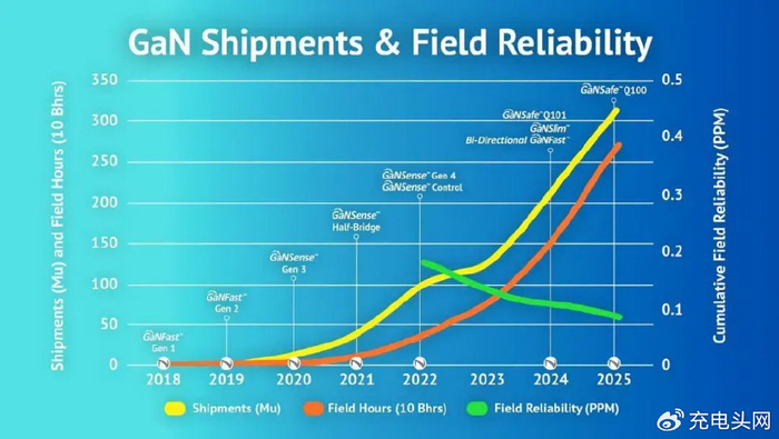 纳微半导体的GaNSafe氮化镓功率芯片通过AEC-Q100和AEC-Q101车规认证,彰显其高可靠性和稳定性,满足汽车电子供应链的严苛要求。同时在过去七年,纳微氮化镓芯片出货量超2.5亿颗,同时将现场失效率降至极具竞争力的十亿分之100(ppb),展现出业界领先的的可靠性。