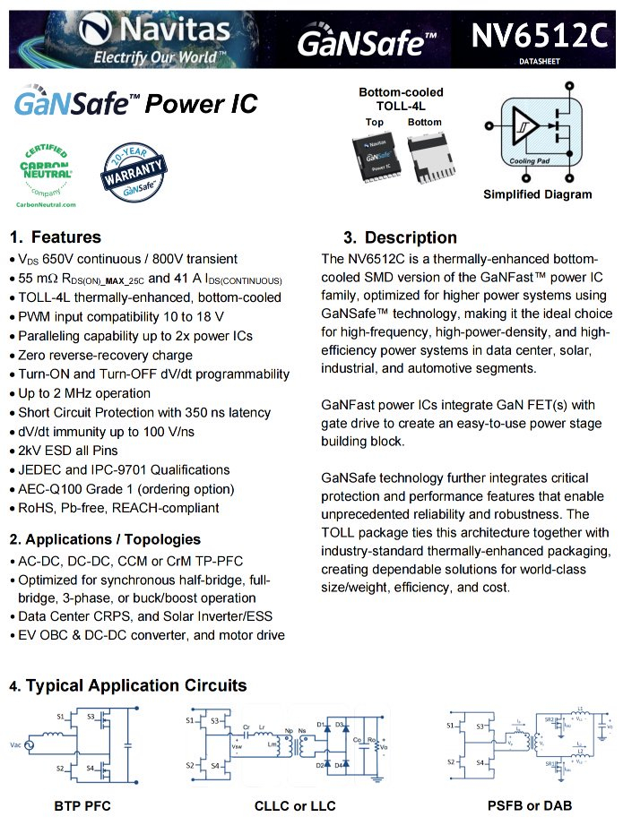 纳微NV6512C是一颗氮化镓功率开关管,内置驱动器,无需外置,耐压650V,漏极电流41A,导阻55mΩ,支持2MHz开关频率,采用散热增强的TOLL-4L封装,适用于数据中心CRPS、太阳能逆变器、电动汽车充电系统、DC-DC转换器以及电机驱动等场景应用。