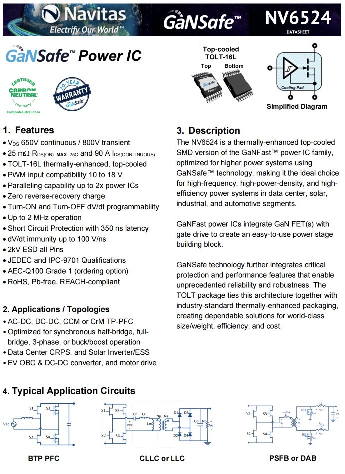 纳微NV6524是一颗氮化镓功率开关管,内置驱动器,无需外置,耐压650V,导阻25mΩ,漏极电流90A,支持2MHz开关频率,采用散热增强的TOLT-16L封装,适用于数据中心CRPS、太阳能逆变器、电动汽车充电系统、DC-DC转换器以及电机驱动等场景应用。