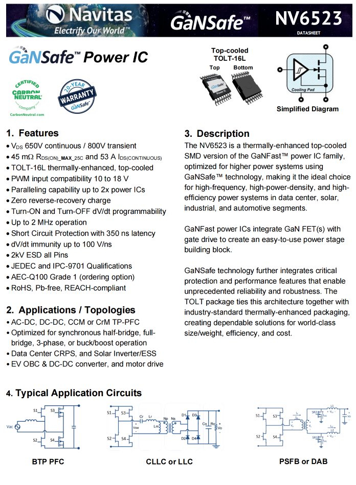 纳微NV6523是一颗氮化镓功率开关管,内置驱动器,无需外置,耐压650V,导阻45mΩ,漏极电流53A,支持2MHz开关频率,采用散热增强的TOLT-16L封装,适用于数据中心CRPS、太阳能逆变器、电动汽车充电系统、DC-DC转换器以及电机驱动等场景应用。