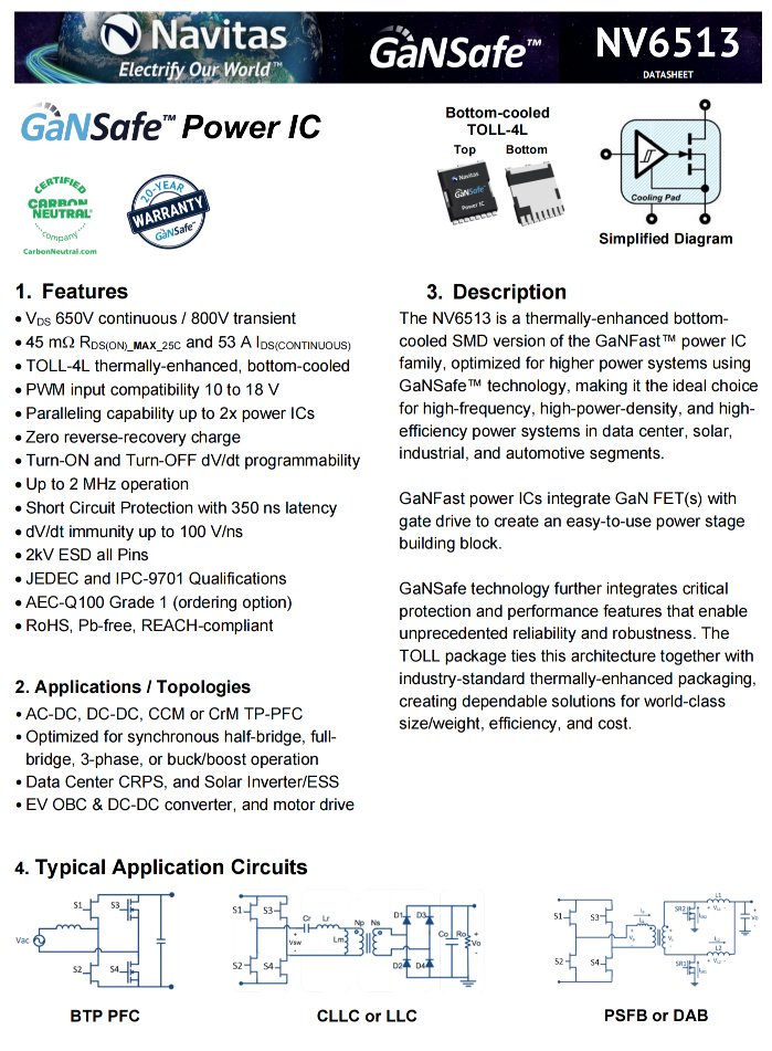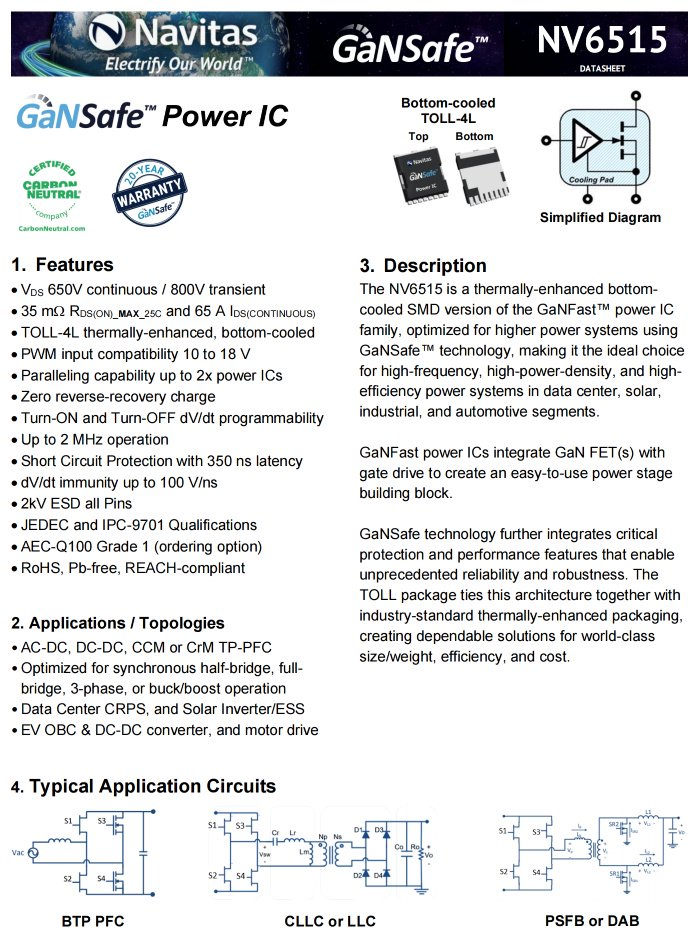 纳微NV6515是一颗氮化镓功率开关管,内置驱动器,无需外置,耐压650V,导阻35mΩ,漏极电流65A,支持2MHz开关频率,采用散热增强的TOLL-4L封装,适用于数据中心CRPS、太阳能逆变器、电动汽车充电系统、DC-DC转换器以及电机驱动等场景应用。