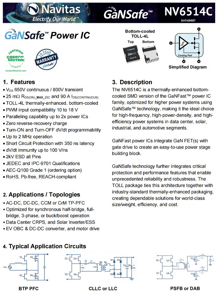 纳微NV6514C是一颗氮化镓功率开关管,内置驱动器,无需外置,耐压650V,导阻25mΩ,漏极电流90A,支持2MHz开关频率,采用散热增强的TOLL-4L封装,适用于数据中心CRPS、太阳能逆变器、电动汽车充电系统、DC-DC转换器以及电机驱动等场景应用。