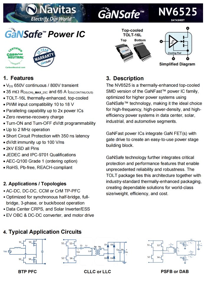 纳微NV6525是一颗氮化镓功率开关管,内置驱动器,无需外置,耐压650V,导阻35mΩ,漏极电流65A,支持2MHz开关频率,采用散热增强的TOLT-16L封装,适用于数据中心CRPS、太阳能逆变器、电动汽车充电系统、DC-DC转换器以及电机驱动等场景应用。