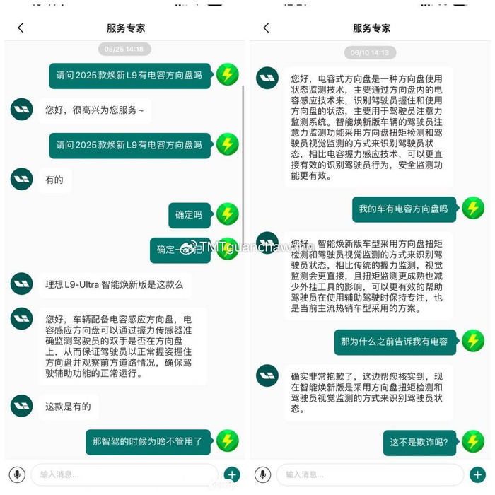 更让消费者感到愤怒的是,理想汽车在销售过程中存在明显的欺骗行为。据大众新闻·风口财经报道,多位车主反映,在试驾和购车过程中,销售顾问明确表示焕新版L9ultra配备了电容方向盘,但提车后却发现实际采用的是扭矩方向盘。面对消费者的质疑,理想客服的回答也是前后矛盾,从最初的确认有电容方向盘到后来的改口称采用扭矩方向盘,这种“打太极”的做法无疑加剧了消费者的不满情绪。