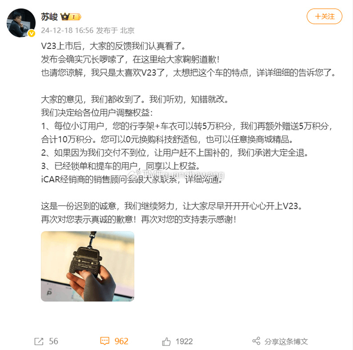 面对市场的强烈反响,苏峻虽迅速在社交平台上道歉,并给出了积分补偿的补救措施,但这一切似乎都未能挽回消费者的心。从目前的市场表现来看,iCAR V23的“慢热长红”之说,更像是一个遥不可及的梦想。