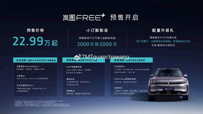 6月24日,以“岚图FREE+「超」好开”为主题的岚图FREE+预售直播在武汉举行。岚图汽车品牌大使邓超惊喜登场,全程体验了岚图FREE+的进阶硬核实力和智能科技。岚图汽车CEO 卢放宣布岚图FREE+正式开启预售,全系标配华为乾崑智驾ADS 4和鸿蒙座舱HarmonySpace 5,售价22.99万元起,更有包括2000元抵5000元定金膨胀、价值18000元配置升级礼在内的价值21000元预售权益。