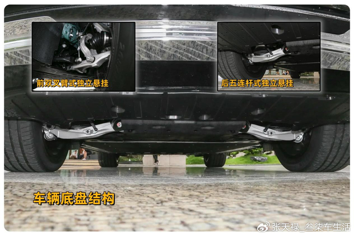 底盘方面,这款车采用了前双叉臂、后五连杆的悬挂结构,并且高配车型还采用了空气悬挂,支持悬挂的软硬、高低调节,中低配车型也是可以选装的。