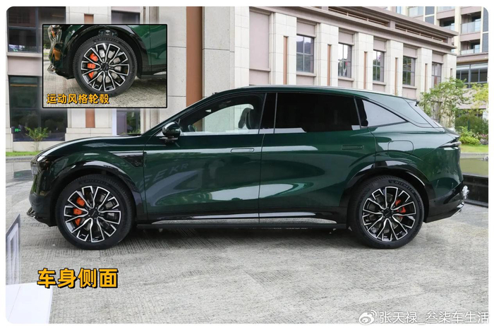 来到车侧,这款车的车身尺寸,长宽高分别为:4825mm、1930mm、1666mm(1656mm),轴距为2925mm。我们可以看到这款车配备了一款多幅式的轮毂,搭配橙色的刹车卡钳,运动感十足,轮胎规格为255/50 R19,也可以选装20英寸的轮毂。