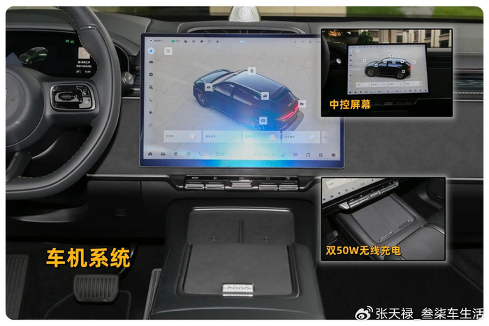 内饰方面,同样采用了极简的设计风格,13.02英寸的全液晶仪表+16英寸的中控大屏幕以及HUD抬头显示,也是当下的新能源车的主流设计,并且它还在中控屏幕的下方设计有一排实体按键,操作起来很方便,这个设计值得推荐,目前很多车型上都是完全没有实体按键的。怀挡的设计也让它的前排拥有了更多的储物空间,前排双50W的无线充电也是全系标配,并且在前、后排各有两个最大60W的充电接口,车上充电方便快捷。