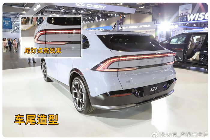 来到车侧,我们可以看到小鹏G7采用了溜背造型设计,并且配备了无边框外后视镜以及车侧的摄像头。它的车身尺寸,长宽高分别为4892mm、1925mm、1655mm,轴距为2890mm,并且提供18英寸和20英寸轮毂可供选择。尾部造型很有层次感,并且采用了环形的贯穿式尾灯设计,非常具有辨识度。