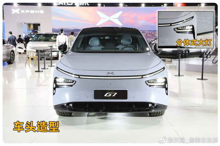 首先,在外观设计上,小鹏G7采用了最新的家族化设计,延续P7+的车头造型,采用贯穿式日间行车灯、分体式大灯组以及下方两侧的主动式进气格栅。