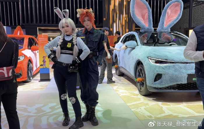 这三台车的车身配色和装饰,活脱脱像是三只真正的小动物,引来了不少人的围观,现场更是有真人扮演的电影人物IP尼克和朱迪到场助阵,整个展馆都被年轻快乐的气氛包围着。