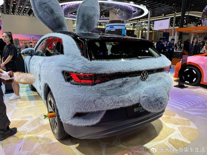 “兔子警官”朱迪的联名定制车辆则是一台ID.4 CROZZ,这台车采用了蓝色的毛绒车衣覆盖全车,只露出了两个大灯像是小兔的眼睛,车顶两个大大的兔子耳朵,看上去既有威严又非常的可爱,轮毂中心的位置还用胡萝卜装饰,为整个车身提亮了不少。