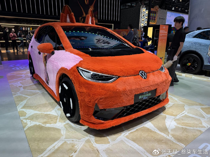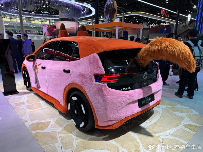 ID.3 GTX的尼克版本非常的亮眼,橘黄色和粉色搭配的毛绒车身以及一条高高翘起的尾巴,简直太可爱了,车门上更是有尼克的形象图案,一只精神的小狐狸。