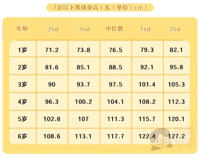 例如,6岁小男孩身高是 121cm,说明他处在中位数和【1SD】之间,属于正常范围呢。