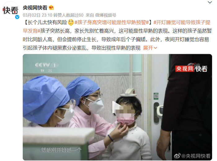 “长个儿太快有风险”“孩子身高突增可能是性早熟预警”......
