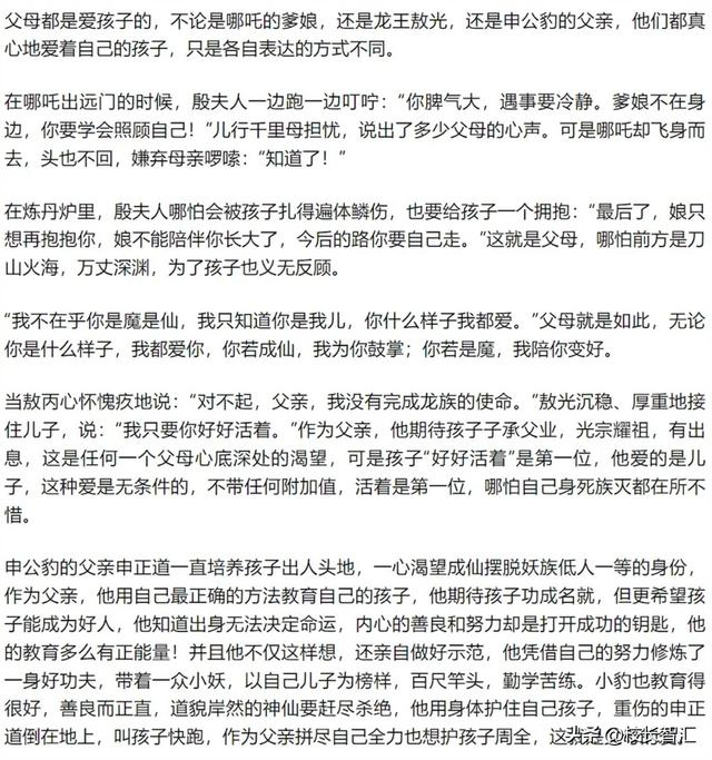 也许这样的爱,只是想用自己的经验为孩子谋个幸福而已,或许并不完美,好在哪吒在陪伴中学会了责任,敖丙仍然是人人羡慕的“别人家的孩子”,申公豹哪怕遭遇不公仍然记住了“行心中大义”。这就是父母教育的意义和价值。