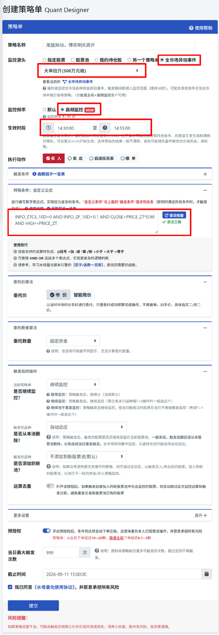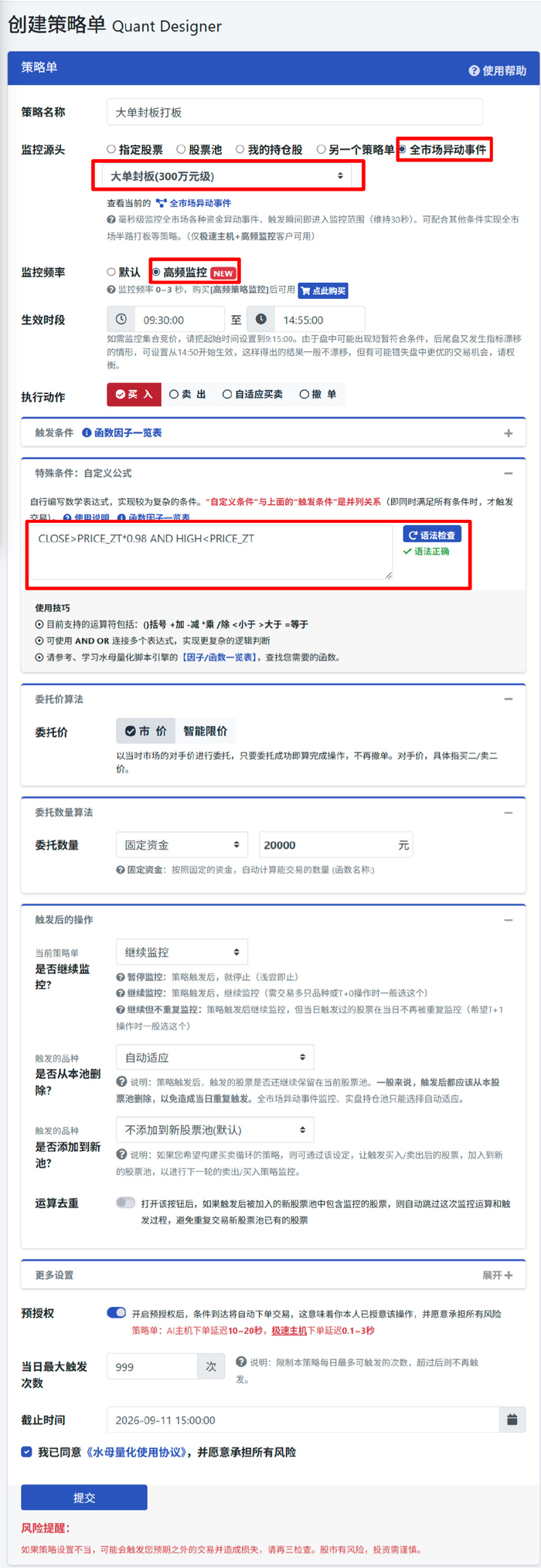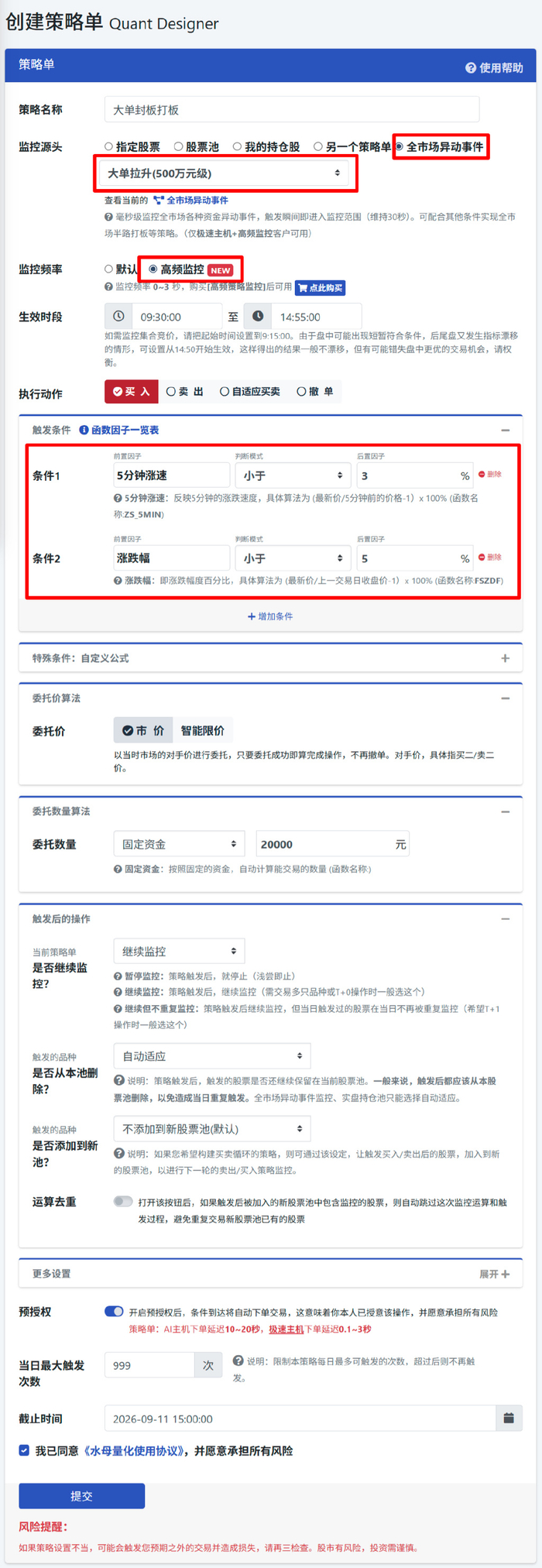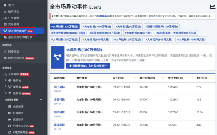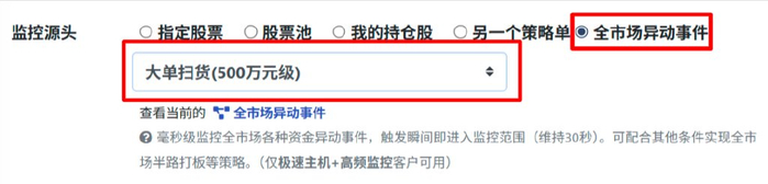 我们在策略单的监控源头参数设置中新增加了【全市场异动事件】的选项,可使用“大单封板(90/100/300/500/1000万元级)、大单拉升(200/500/1000万元级)、大单扫货(500万元级)“等因子。