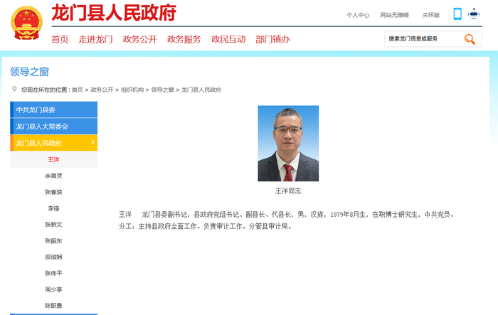 3月26日,龙门县人民政府官方网站“领导之窗”栏目更新,王洋任龙门县委副书记,县政府党组书记、副县长、代县长。