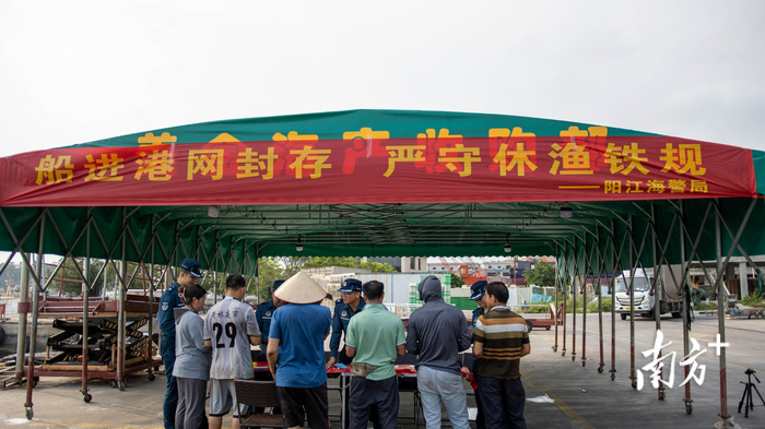 “请广大渔民朋友做到船靠港、人上岸、网封存,有序休渔。”连日来,阳江海警局执法员进渔港、下渔船、钻渔排,张贴2025年南海伏季休渔宣传海报,悬挂休渔横幅,给辖区渔民宣传讲解政策法规,通过发放休渔宣传手册,设置政策宣讲点的方式向渔民阐述伏季休渔的重要意义,引导渔民自觉遵守休渔规定,争当渔业资源保护者。同时,阳江海警局还组织执法员到渔船上帮助渔民检查消防器材,归置捕捞器具,暖心服务渔民,全力做好休渔准备。