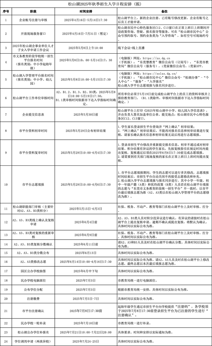 (一)本次入学申请,“东莞市义务教育阶段学校统一招生平台”关闭时间为2025年5月14日17:30;“松山湖入学管理平台”关闭时间为2025年5月15日17:30(企业审核截止时间为2025年5月19日17:30),逾期网上平台将自动关闭,不再受理报名。有关日程安排详见《2025年松山湖招生工作进度安排》。