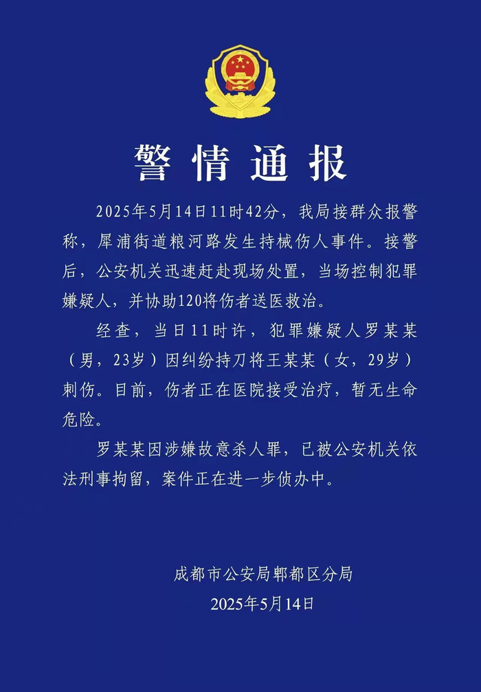2025年5月14日11时42分,警方接群众报警称,犀浦街道粮河路发生持械伤人事件。接警后,公安机关迅速赶赴现场处置,当场控制犯罪嫌疑人,并协助120将伤者送医救治。